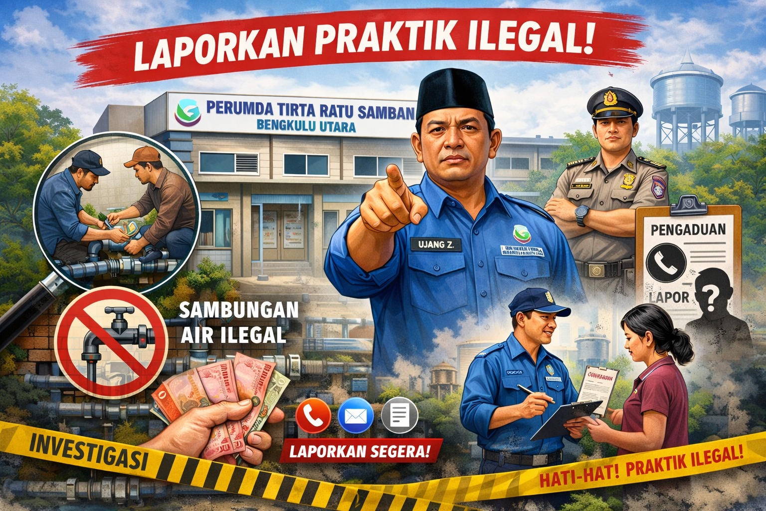 Direktur Perumda Tirta Ratu Samban, Ujang Zakaria, S.H mengingatkan masyarakat agar lebih waspada dan tidak mudah tergiur dengan tawaran pemasangan sambungan air baru yang dilakukan di luar mekanisme kantor, terutama jika disertai permintaan biaya yang tidak sesuai ketentuan.