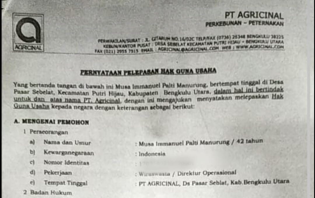 “Permasalahan ini jelas. Pada tahun 2020, PT Agricinal secara resmi melepaskan HGU melalui surat pernyataan yang ditandatangani oleh pihak terkait,” ujar Sosri, Sabtu (14/12/2024).